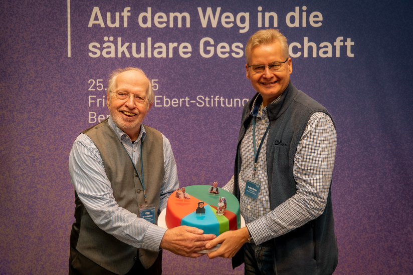 Dr. Carsten Frerk und Matthias Krause mit der fowid-Torte, Foto: Ricarda Hinz